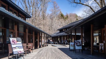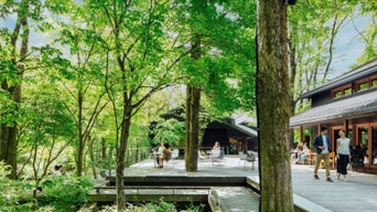 1日目の締めくくりに選んだのは、軽井沢ライフを満喫できる「軽井沢星野エリア」の玄関口にある「ハルニレテラス」。フラワーフィールドからは10分ほどで到着しました。ハルニレテラスは「軽井沢の日常」をコンセプトに16のショップ・レストランが並ぶ“小さな街”。洗練された建物群、名前の由来となった100本を超える「春楡」の木立、そしてテラスそばを流れる湯川が心地よい避暑地時間を演出しています。